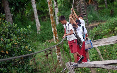 Crianças são forçadas diariamente a atravessar uma ponte em condições bastante precárias para chegar à escola primária em que estudam em Pariaman (Indonésia).